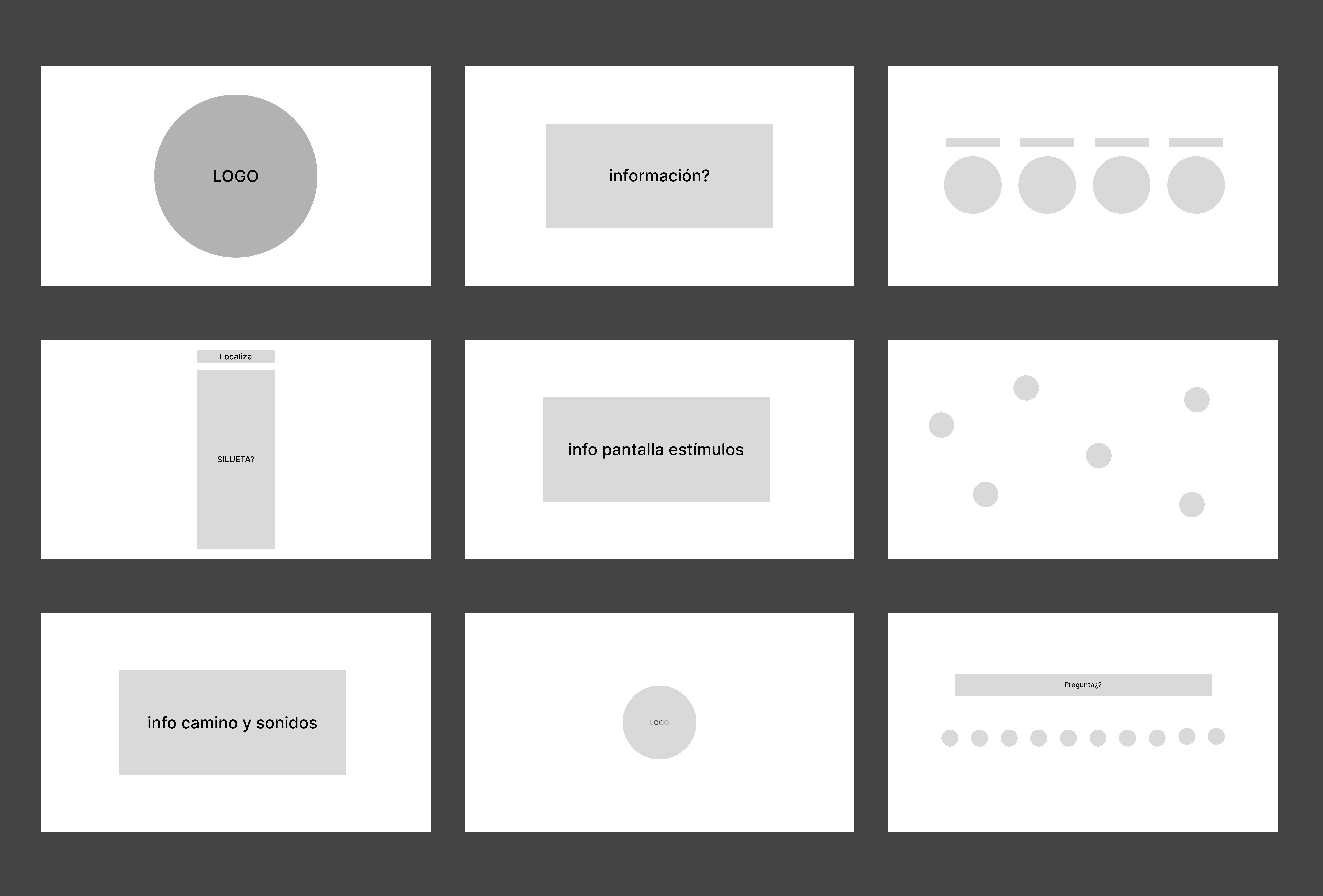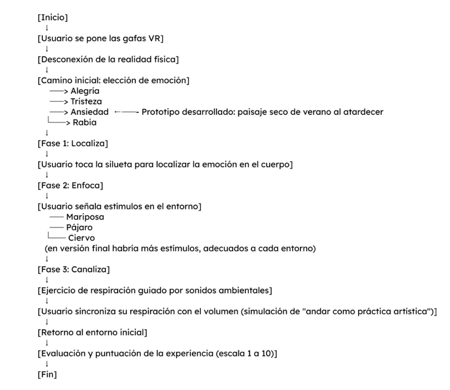 El flujo comienza con la selección de cómo se siente, dando paso a un entorno visual y sonoro personalizado donde la interacción se basa en la exploración,