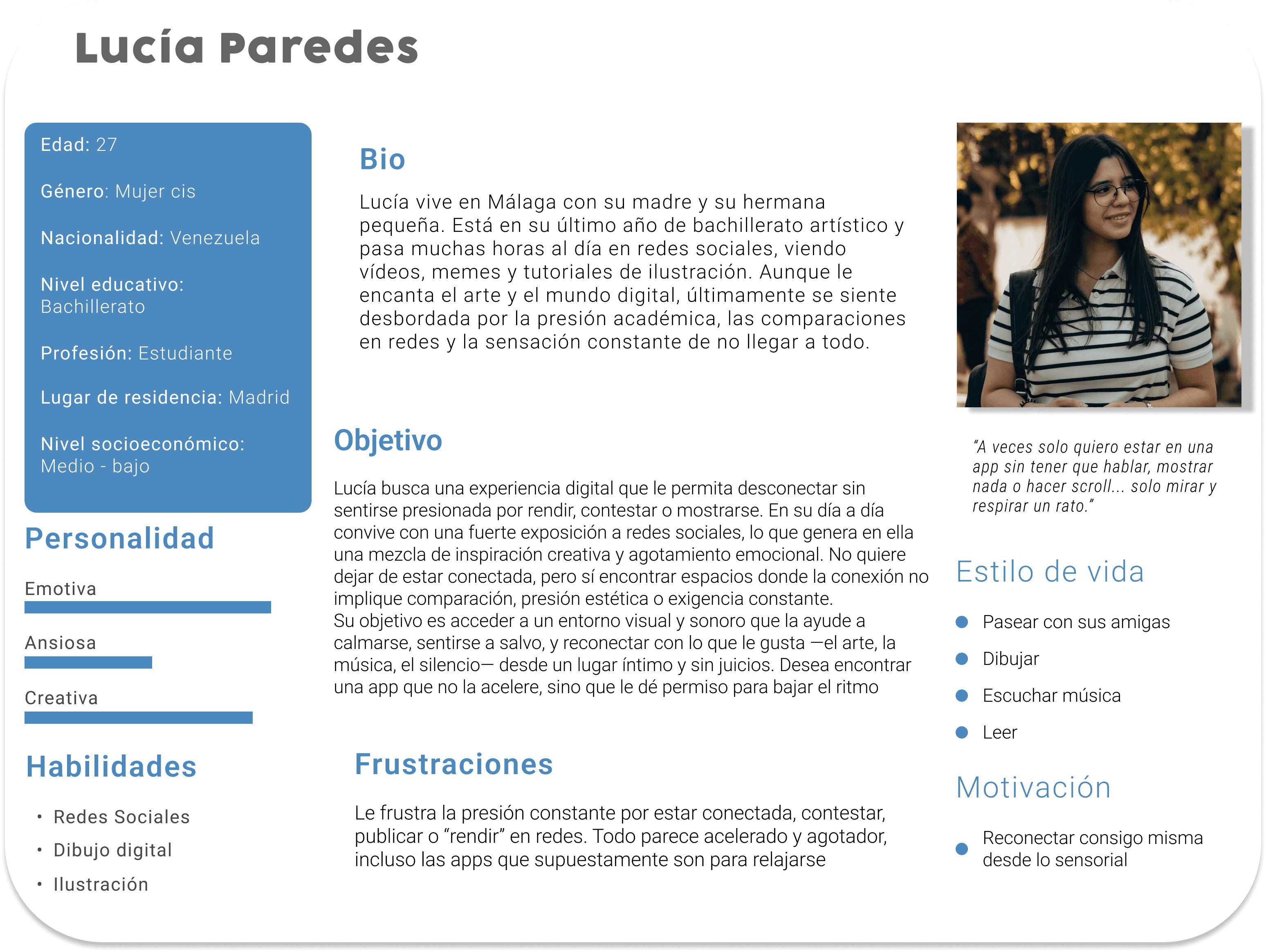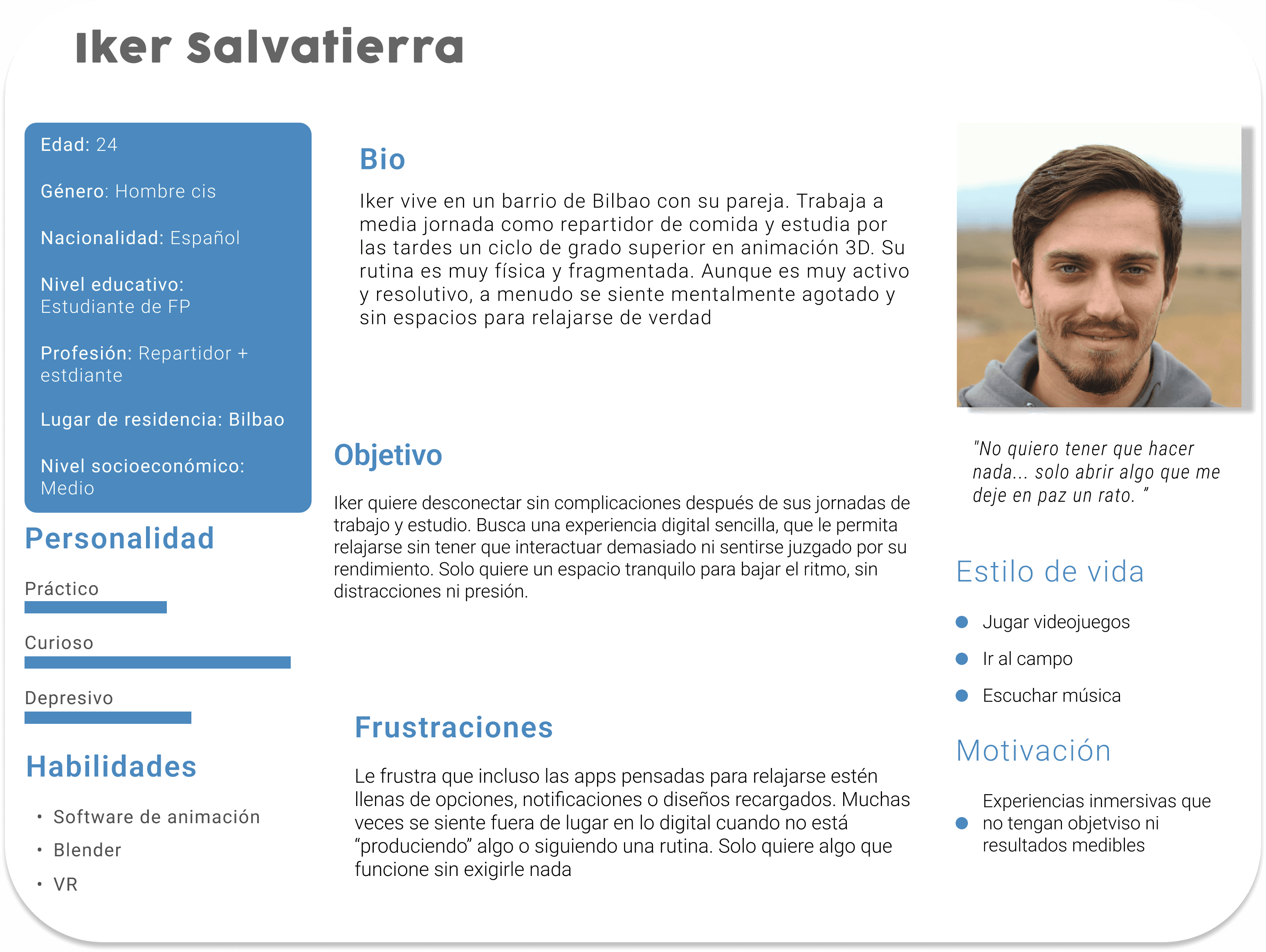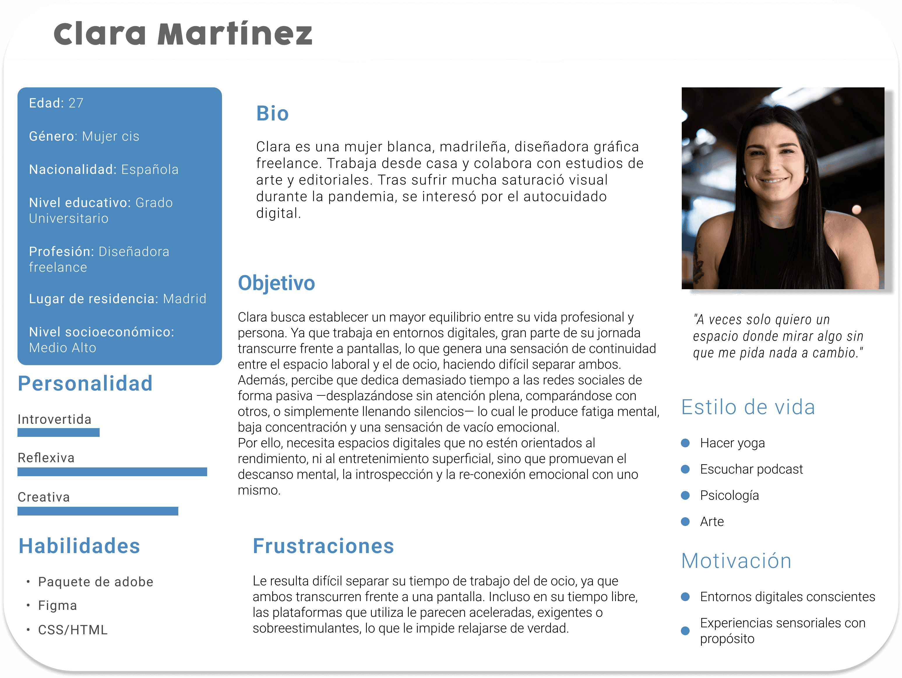 Estos insights permitieron definir un usuario digitalmente activo, familiarizado con la tecnología, pero con una necesidad clara de reducir el ritmo y encontrar momentos de pausa dentro del entorno digital.
